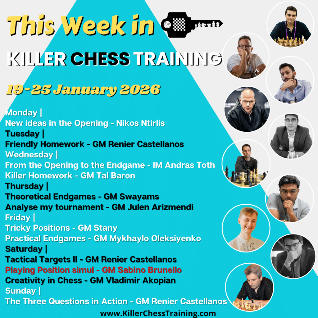 We will have the monthly Playing Position simul this Saturday, the 24th of January. GM Sabino Brunello will play against members of the academy from a given position. If you’d like to join the simul, please join our team on lichess. Mention your name and membership email in your application. The link for the simul will be shared on Saturday, usually 10-15 minutes before it starts. It will be available in the website schedule. You will also receive it through a lichess message. Please be on time! Once the simul starts, it is no longer possible to join it.