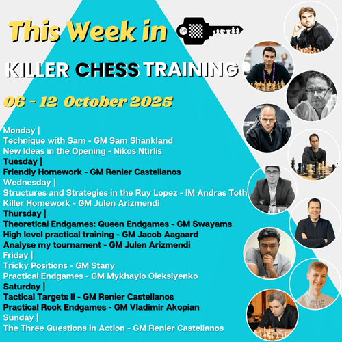 There have been two changes in the initial schedule for this week. Jacob is travelling and had to cancel his High Level Practical Training class that was scheduled for Wednesday, the 8th of October. A new class has been added on Sunday at 4 PM UK time. GM Renier Castellanos will host a session where he will show The Three Questions in Action.